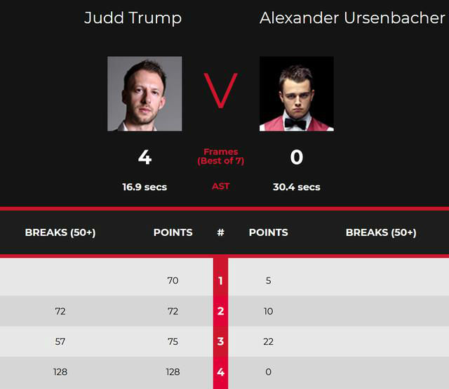 第一局,尤森巴赫机会不多,特鲁姆普多杆上手,70-5轻松取得了开门红。第二局和第三局,特鲁姆普继续发力,连续打出了单杆72分和单杆57分,72-10和75-22连赢两局,3-0早早拿到了赛点。