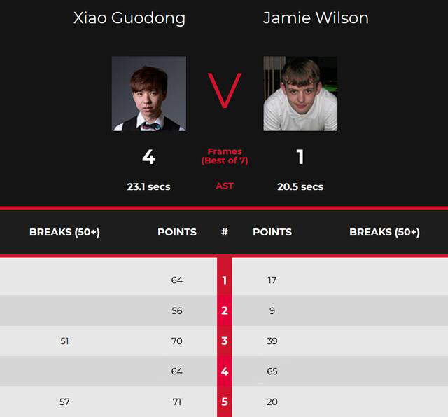 第一局,威尔逊17分后中断,肖国栋上手57-17反超进入防守,威尔逊漏球,肖国栋再上手顺利超分拿下,1-0开门红。第二局,肖国栋多杆上手打到了52分,威尔逊追分,但还是认输,肖国栋再下一城。