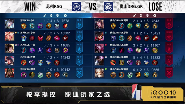 第一局开局双方选择换线。3分钟中路团双方2换2。4分11秒苏州KSG拿下暴君。4分20秒野区团佛山DRG.GK打出0换2。5分38秒佛山DRG.GK摧毁敌方对抗路外塔。6分46秒苏州KSG摧毁敌方中路外塔。7分04秒佛山DRG.GK拿下先知主宰。8分钟佛山DRG.GK野区击杀上官婉儿。8分36秒佛山DRG.GK摧毁敌方发育路外塔。9分15秒苏州KSG拿下暴君。11分02秒佛山DRG.GK拿下暗影主宰。11分50秒佛山DRG.GK摧毁敌方对抗路二塔。12分32秒苏州KSG拿下暗影暴君。12分49秒佛山DRG.GK高地处击杀公孙离。13分23秒佛山DRG.GK摧毁敌方中路外塔。14分05秒苏州KSG中路击杀老夫子。14分55秒苏州KSG拿下暗影暴君,中路团双方2换2。16分36秒苏州KSG拿下暗影主宰。17分35秒双方中路1换1。19分04秒苏州KSG摧毁敌方中路二塔。19分20秒苏州KSG高地处打出0换3团灭对手。19分39秒苏州KSG摧毁敌方水晶拿下比赛。