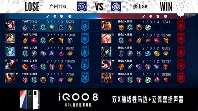 2分17秒,佛山GK控下暴君。3分32秒,广州TTG橘右京上路击杀越塔的东皇太一拿下一血。3分54秒,佛山GK击杀橘右京。5分22秒,佛山GK控下先知主宰。6分52秒,佛山GK控下暴君。8分22秒,佛山GK破掉广州TTG中一塔。9分43秒,河道团,双方3换3。10分20秒,广州TTG公孙离越塔击杀吕布。10分55秒,广州TTG控下暗影暴君。11分52秒,广州TTG破掉佛山GK上二塔,随后佛山GK镜单带掉广州TTG下二塔。12分29秒,佛山GK控下暗影主宰。15分37秒,佛山GK拿下暗影暴君并击杀关羽。16分30秒,佛山GK破掉广州TTG上二塔。17分13秒,佛山GK控下暗影主宰。18分26秒,佛山GK击杀张飞,随后破掉广州TTG中二塔。19分钟,佛山GK破掉广州TTG上高地。20分54秒,广州TTG橘右京抢到风暴龙王,随后团战广州TTG打出1换2。21分58秒,广州TTG破掉佛山GK中路两座外塔。22分31秒,佛山GK上高地反打打出2换3。22分51秒,广州TTG风暴先锋破掉佛山GK下高地。24分20秒,双方团,广州TTG打出1换2。25分26秒,河道团,广州TTG击杀虞姬,橘右京与姜子牙偷掉风暴龙王。26分27秒,广州TTG破掉佛山GK上高地,佛山GK击杀公孙离。29分40秒,双方团战1换1。30分42秒,佛山GK团战打出0换2。32分27秒,佛山GK控下风暴龙王,随后破掉广州TTG中高地。33分20秒,广州TTG击杀吕布,随后佛山GK破掉广州TTG下高地。35分钟,佛山GK打出0换3。35分22秒,佛山GK摧毁广州TTG水晶先下一城。