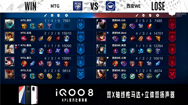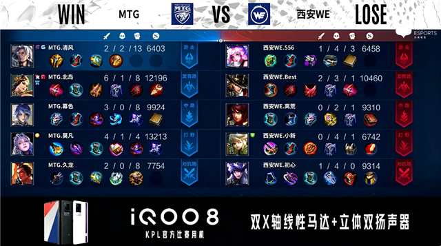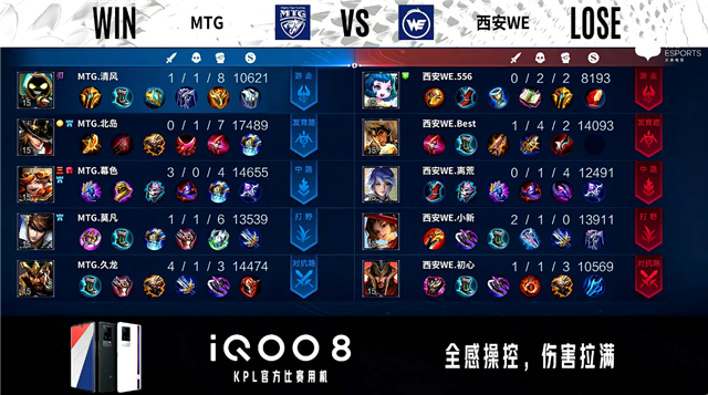 2分31秒MTG发育路击杀成吉思汗拿到一血。6分56秒发育路团战西安WE打出2换3。12分31秒MTG拿下主宰。13分13秒MTG摧毁敌方发育路二塔。13分22秒MTG摧毁敌方中路外塔。14分43秒MTG摧毁敌方对抗路二塔。15分44秒对抗路团战双方1换1。21分41秒野区团战MTG打出0换5,沈梦溪拿到三连决胜。22分07秒MTG摧毁敌方水晶拿下比赛。