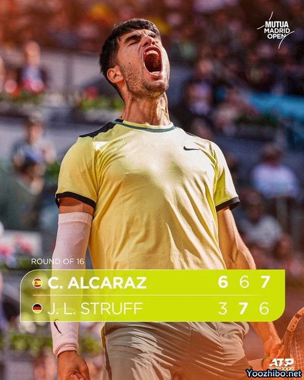 在ATP大师赛马德里站的第四轮比赛中,2号种子阿尔卡拉斯与23号种子施特鲁夫进行了激烈的对抗。最终,阿尔卡拉斯以6-3、6-7(5)、7-6(4)的成绩战胜了施特鲁夫,成功晋级八强2。