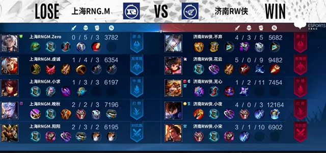 前期上海RNG.M在上路发起进攻,拿下蒙恬的一血,而济南RW侠选择包夹下路,成功击杀三人,但在随后的射手PK中,孙尚香完成单杀,暂缓对方攻势。中期济南RW侠五人抱团,在中路造成减员后,率先击破中一塔,开启推进节奏。关键时刻,虽然晚秋镜绕后击杀公孙离,但赵云精准出击,收割全场三连决胜,济南RW侠连破两路高地。最终,蒙恬果断开团,济南RW侠击杀双C后,直点水晶,率先来到赛点!