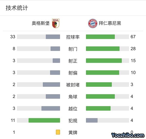 第27分钟,拜仁扳平比分!格纳布里右路斜传禁区舒波莫廷插上小角度推射破门,奥格斯堡1-1拜仁。