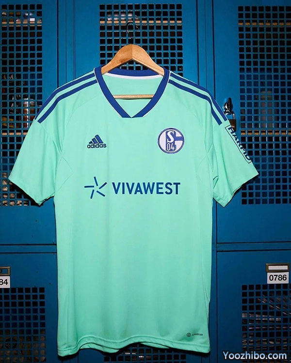 2022-23赛季沙尔克第二客场球衣以清新另类的薄荷绿色呈现,而作为俱乐部象征的皇家蓝色则出现在衣领以及肩膀位置的阿迪达斯胜利三条纹中。球衣正面的adidas Logo以及广告等也以皇家蓝色呈现。
