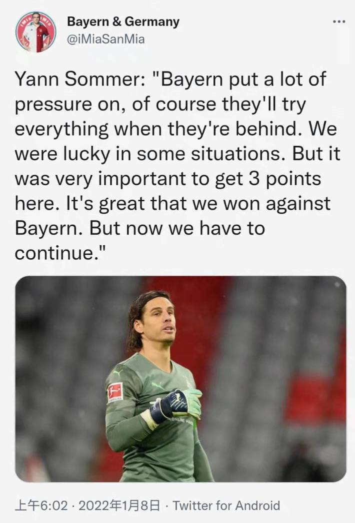 24直播网01月08日讯 ,德甲联赛第18轮,拜仁慕尼黑主场1-2不敌门兴格拉德巴赫。赛后,本场比赛的功臣门将佐默谈到了本场比赛。