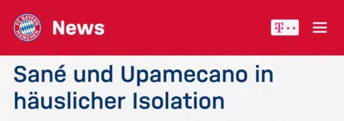 拜仁官方:萨内、于帕梅卡诺感染新冠病毒