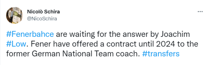 斯基拉表示,费内巴切为勒夫提供了一份2024年到期的合同,他们正在等待这位前德国国家队主帅的答复。