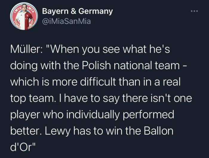 穆勒说:“没有任何讨论的必要,莱万必须赢得金球奖。”
