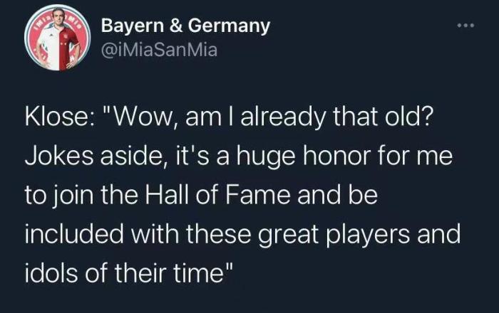 在谈到自己入选名人堂时,克洛泽调侃道:“哇,我已经这么老了吗?开玩笑罢了。对我来说和这些伟大的球员一起入选德国足球名人堂,对我来说是巨大的荣誉。”