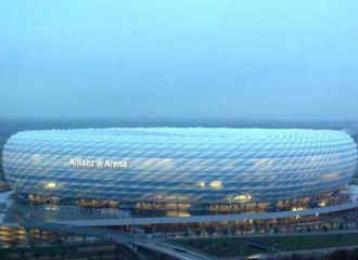 慕尼黑安聯競技球場(Allianz Arena),投資金額:2.8億歐元觀衆席容量:66,016 安聯體育場被選作2006年德國世界盃開幕式賽場。這棟建築以它精巧的結構壯麗的外觀,成爲慕尼黑以至於德國的榮耀。安聯體育場被選作2006年德國世界盃開幕式賽場。這棟建築以它精巧的結構壯麗的外觀,成爲慕尼黑以至於德國的榮耀。體育場的表面由透明的菱形膜結構構成,在陽光下閃爍著微光,有種魔幻的視覺效果。而在夜間,它可以由燈光打出紅藍兩色(拜仁與1860的顔色)。