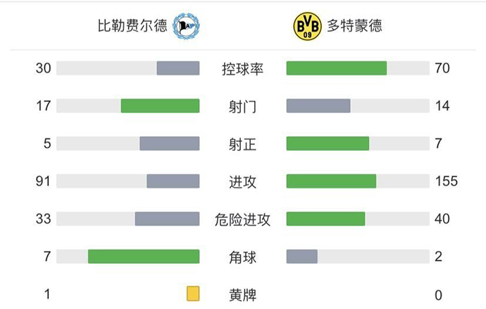 第71分钟,奥特加后场大脚开球,胡梅尔斯禁区内卡住身位成功护球。第72分钟,罗伊斯回敲,贝林厄姆禁区左侧一条龙突破,连过三人后搓射远角得手,比勒菲尔德0-3多特蒙德!