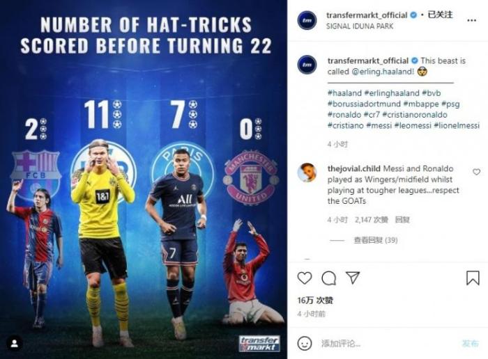 24直播网10月22日讯 多特蒙德前锋哈兰德22岁前上演了11次帽子戏法,姆巴佩有7次,梅西2次,C罗0次。哈兰德的帽子戏法数多于同年龄的姆巴佩、梅西和C罗之和。