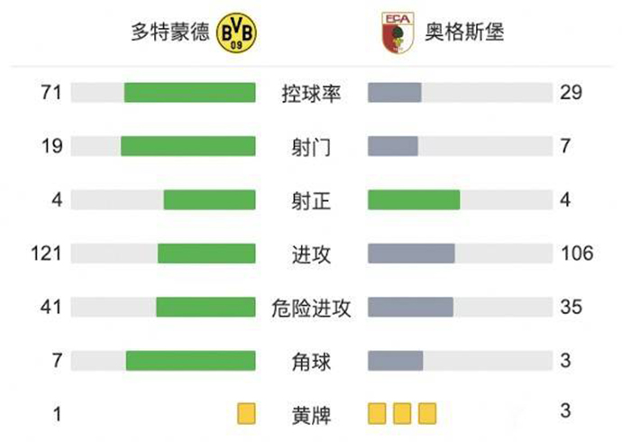 第84分钟,奥格斯堡断球后送出一脚长传,尼德莱赫纳获得单刀但越位在先。全场比赛结束,多特蒙德2-1奥格斯堡。