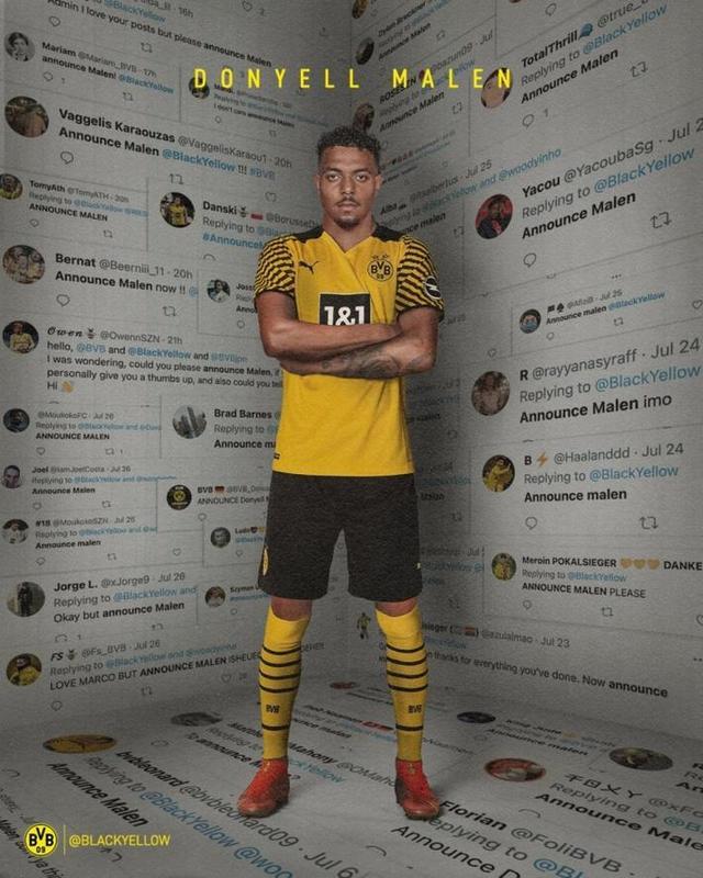 22岁的马伦上赛季出场45次,贡献27球9助,在桑乔离队后,多特蒙德签下这名球员作为代替。