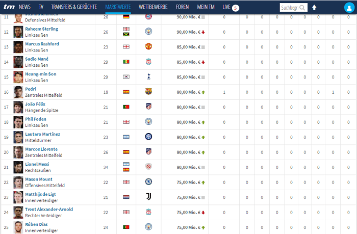 而再往后,并列第13名的是曼联的拉什福德、利物浦的马内和热刺的孙兴慜,他们的身价都是8500万欧元。而并列第16名的球员是梅西、巴萨的佩德里、马竞的菲利克斯、曼城的福登、国米的劳塔罗和马竞的略伦特,他的身价都是8000万欧元。需要说一下的是,不少意大利球员的身价都有了大幅上涨,比如基耶萨的身价上涨到7000万欧元,唐纳鲁马和巴雷拉的身价都上升到了6500万欧元等等。