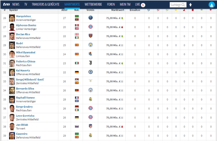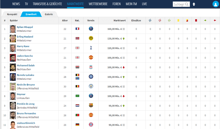 如图,目前足坛身价最高的球员是巴黎的姆巴佩,他的身价是1.6亿欧元,而姆巴佩身后则是哈兰德,他的身价从1亿欧元上升到了1.3亿欧元。而第三的则是热刺的凯恩,他的身价依然是1.2亿欧元,第四的是曼联的桑乔、利物浦的萨拉赫、国米的卢卡库、曼城的德布劳内和巴黎的内马尔,他们的身价都是1亿欧元。其中,内马尔和萨拉赫的身价都有不小的下跌。而并列第九的是巴萨的德容、曼联的B费、拜仁的基米希和曼城的斯特林,然的身价都是9000万欧元。