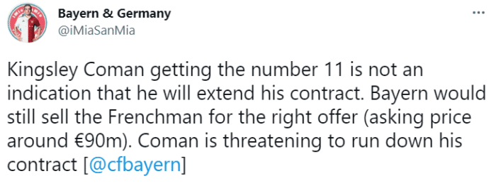 该记者表示,科芒改穿拜仁11号不代表他一定留队,如果报价合适,拜仁还是愿意出售这名法国边锋的。
