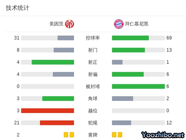 第41分钟,美因茨反击右路传中,金玟哉冒顶,奥利塞头球解围不远,齐布射门发生折射,李在成包抄抢射破门,拜仁0-1落后美因茨。