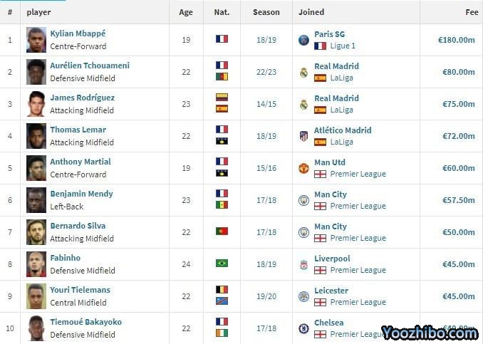 摩纳哥队史卖人排行榜前十: