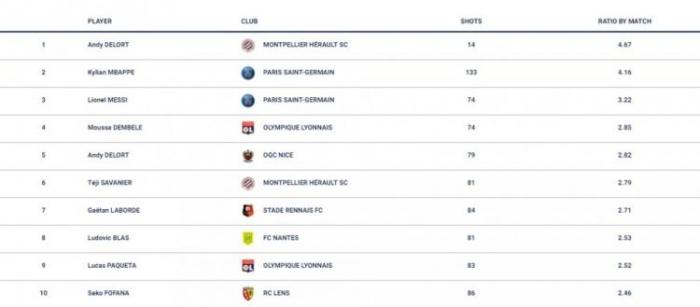 法甲本赛季场均射门榜(括号内为射门总次数):
