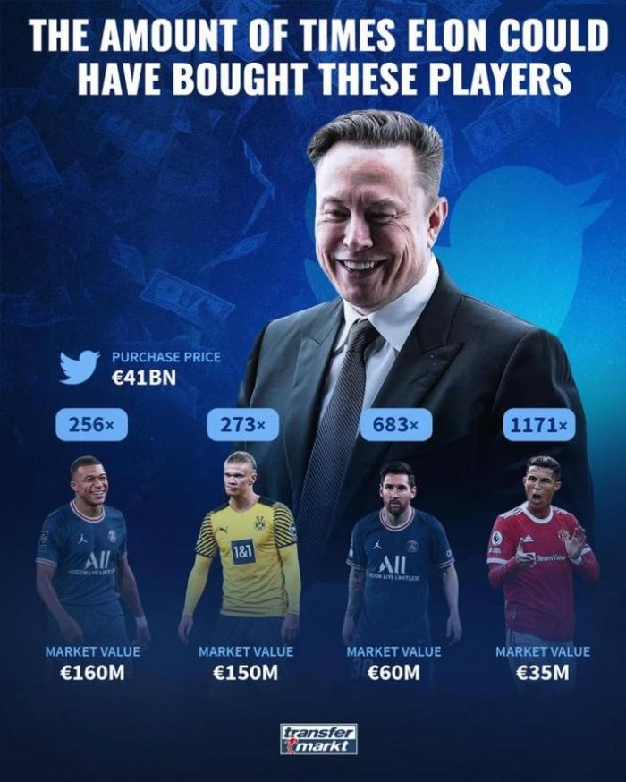 24直播网04月29日讯美国科技富豪马斯克最近斥资410亿欧元收购推特,德国转会市场今日再次调侃,称410亿欧元可以买256次姆巴佩,买273次哈兰德。