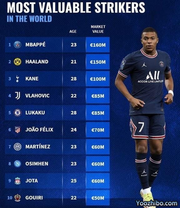 德转前锋身价榜:姆巴佩居首 哈兰德第二
