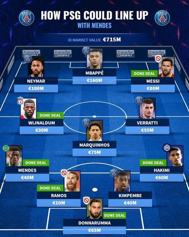 24直播网9月05日讯 今日,德转列出了巴黎潜在的首发预测:梅西内马尔姆巴佩领衔锋线,首发球员总身价高达7.15亿欧。