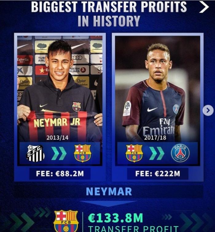 2013年,巴萨花费8820万欧元签下了内马尔,在巴萨踢了几年后,巴黎支付了2.22亿欧元的违约金带走了内马尔,而巴萨因此获益1.338亿欧元的资金。第二的是库蒂尼奥,12-13赛季,利物浦花费了1300万欧元签下了库蒂尼奥,而17-18赛季冬窗,利物浦以1.35亿欧元的价格把他卖给了巴萨,利物浦因此获利1.22亿欧元,也正是这1.22亿欧元,让利物浦崛起了。
