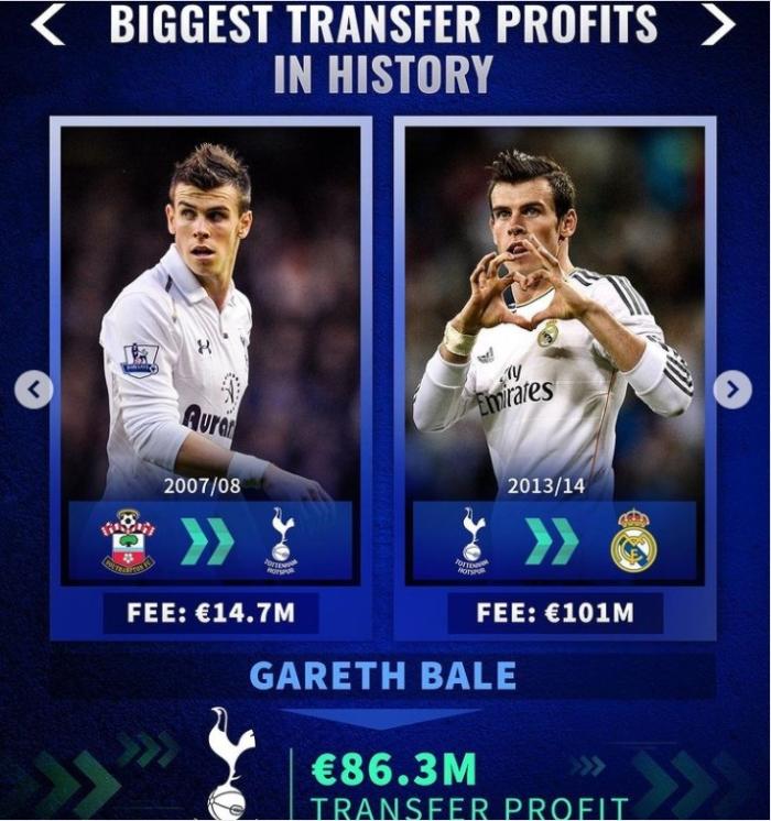 第五的是贝尔,07年夏天,热刺花费了1470万欧元从南安普顿签下了贝尔,而13年夏天,热刺以1.01亿欧元的价格把贝尔送到了皇马,而热刺因此获利8630万欧元。第六是阿扎尔,12年夏天,切尔西花费了3500万欧元从里尔带来了阿扎尔,而19年夏天,阿扎尔以1.15亿欧元的价格转会加盟皇马,切尔西因此获利8000万欧元。