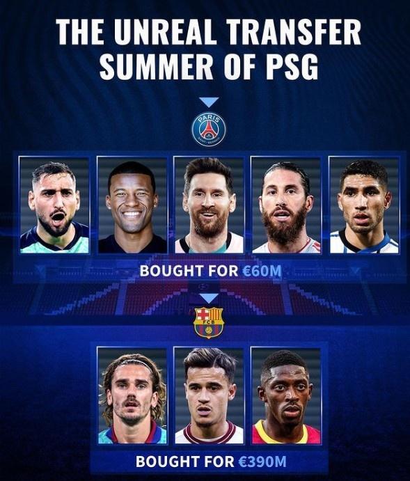 而巴萨则在此前花费了3.9亿欧签下格列兹曼(1.2亿欧)、库蒂尼奥(1.35亿欧)和登贝莱(1.35亿欧)