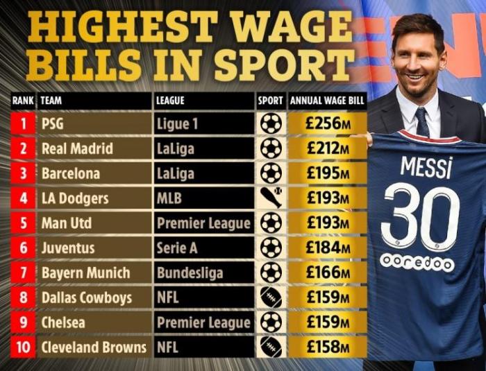 24直播网讯 今日,《太阳报》列出了一份体育界薪水前十榜单,其中共有七支足球俱乐部,其中巴黎圣日耳曼2.56亿镑居首,皇萨分列二三位。