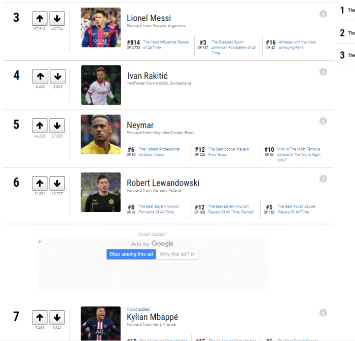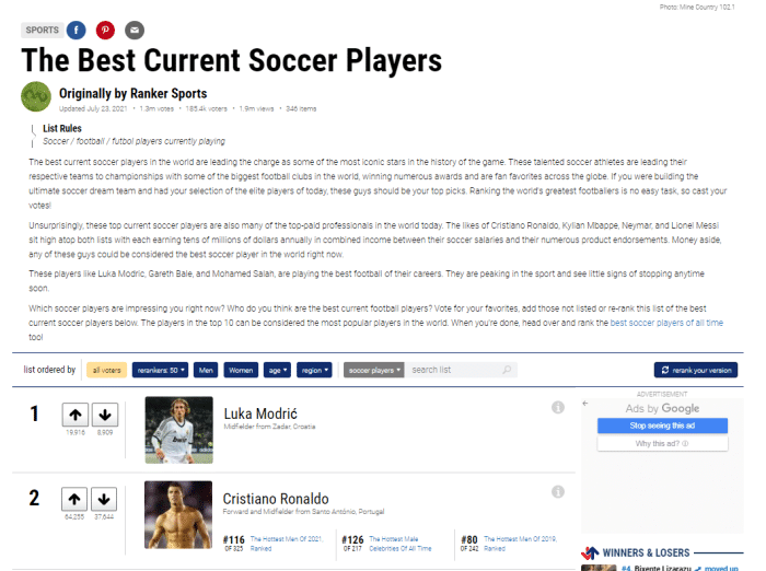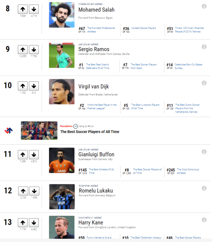 如图,美国媒体ranker让球迷票选现役最好的五十大球星,大约有18万人参加了投票,其中莫德里奇位居榜首,而排名第二的是C罗,排名第三的是梅西,排名第四的是拉基蒂奇,排名第五的是内马尔,排名第六的是莱万,排名第七的是姆巴佩。排名第八的是萨拉赫,排名第九的是拉莫斯,排名第十的是范迪克。随后11到第20分别是布冯、卢卡库、凯恩、博格巴、德布劳内、阿扎尔、坎特、孙兴慜、迪巴拉和马内。