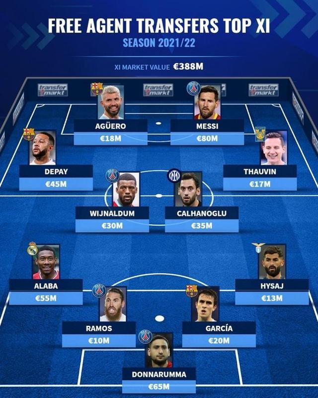 前锋:阿圭罗(曼城→巴塞罗那,1800万欧元),梅西(巴塞罗那→PSG,8000万欧元)