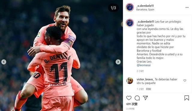 24直播网讯 北京时间8月7日,巴萨球员奥斯曼-登贝莱在个人社交媒体上告别巴萨传奇球员梅西