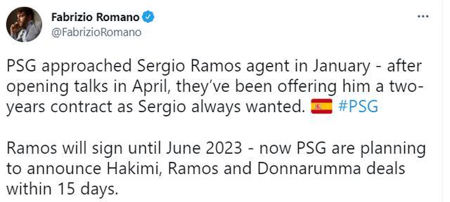24直播网讯据知名转会记者罗马诺报道,巴黎圣日耳曼将在未来15天里连续官宣多纳鲁马、拉莫斯和阿什拉夫三笔强援。
