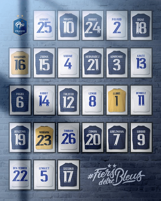 前锋:19-本泽马(皇马)、9-吉鲁(切尔西)、10-姆巴佩(巴黎)、26-小图拉姆(门兴)、20-科曼(拜仁)、22-本耶德尔(摩纳哥)、7-格列兹曼(巴萨)、8-勒马尔(马竞)、11-登贝莱(巴萨)
