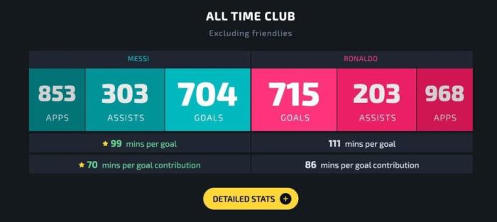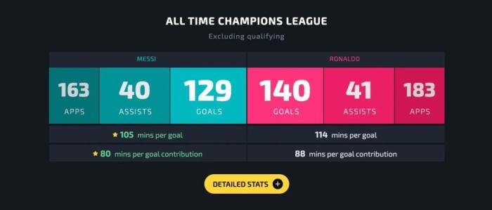 梅西:163次出场,129球、40次助攻,平均每105分钟打入一球,平均每80分钟制造一球。