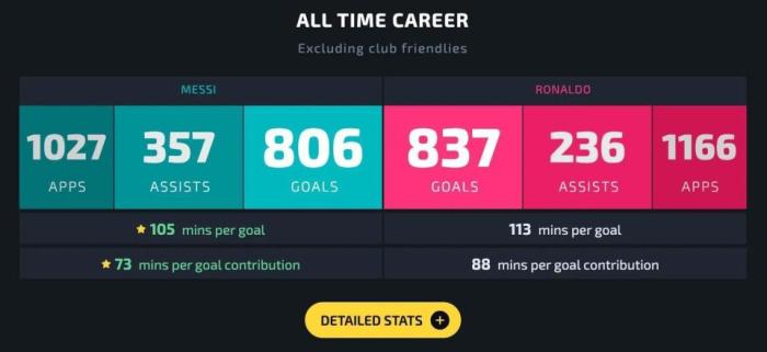 梅西:1027次出场,806球、357次助攻,平均每105分钟打入一球,平均每73分钟制造一球。