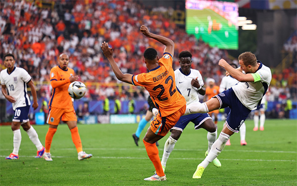 这一幕发生在比赛第15分钟,荷兰后卫邓弗里斯封堵凯恩的射门时,双方的右脚发生接触。最终在VAR介入后,当值主裁茨瓦耶果断判罚点球,并且给邓弗里斯出示黄牌。