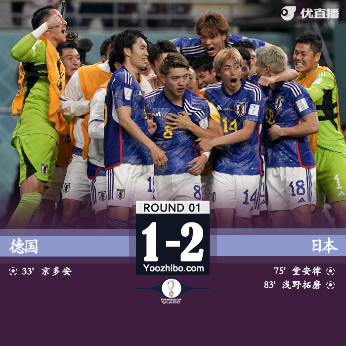 24直播网讯 北京时间11月23日晚上21:00,世界杯E组首轮,德国对阵日本。上半场,劳姆造点京多安主罚命中。下半场,格纳布里中框,京多安中柱,权田修一屡献神扑,酒井宏树失空门,替补登场的堂安律和浅野拓磨先后破门逆转比分。全场结束,德国1-2日本爆出大冷门。