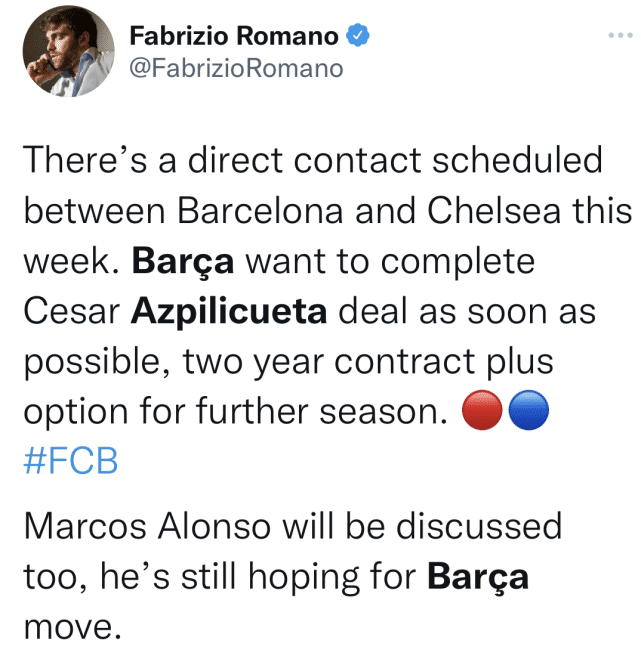 在最近几个小时,巴萨和切尔西进行了接触,目前谈判很深入,这笔交易有望在未来几个小时完成。巴萨计划是在未来一周让阿斯皮利奎塔亮相,并带着他参加7月16日开始的美国行。据悉,巴萨将为32岁的阿兹皮利奎塔准备一份为期2年,并附带第3年续约选择权的合同。