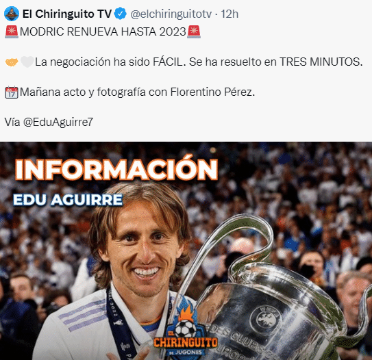 根据此前消息,皇马将与莫德里奇续约一年,消息将在这两天官宣。而六台表示,双方仅谈判了3分钟就达成了协议,皇马和莫德里奇都对继续合作感到激动和期待。