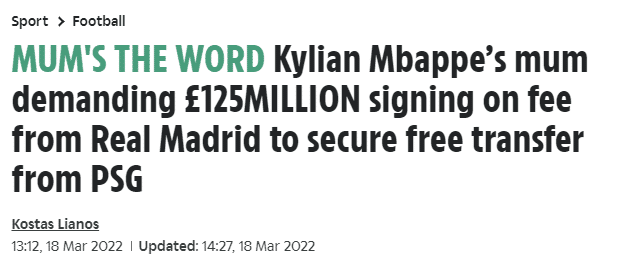 24直播网03月19日讯 西班牙媒体消息,姆巴佩的母亲希望儿子自由加盟皇马时获得1.25亿英镑签字费。