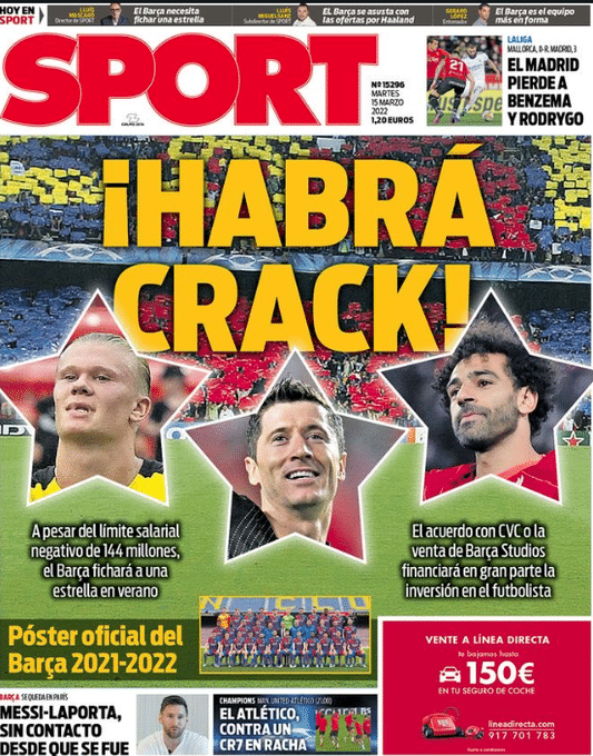 来源:24直播网03-15 20:2824直播网03月15日讯 据《每日体育报》今日头版消息,巴萨将在今夏引进一名超级巨星,莱万、哈兰德和萨拉赫均是候选目标。