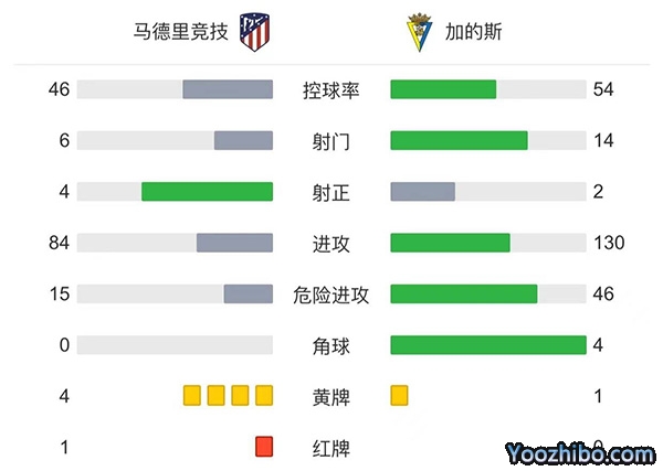第45分钟,加的斯左路传中,内格雷多头球破门,马德里竞技1-1加的斯。
