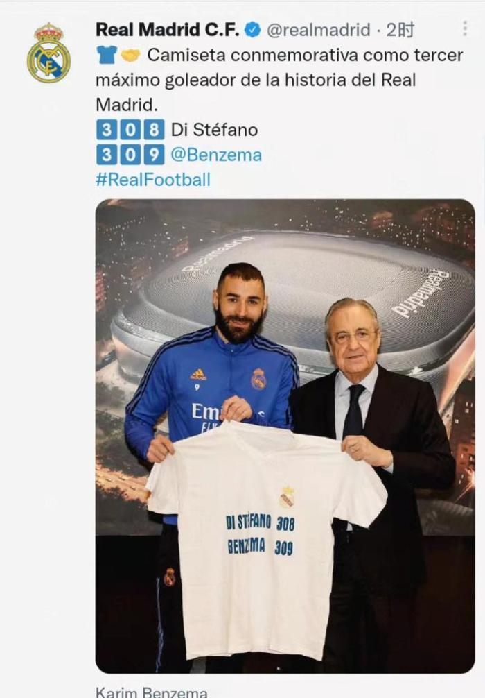 的比赛中,本泽马上演帽子戏法,在皇马的总进球数达到了309个,超过了迪斯蒂法诺的308球,成为队史第三射手。