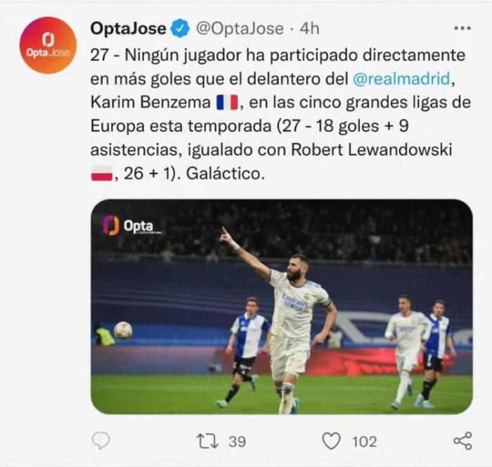 据Opta统计,本赛季欧洲五大联赛,本泽马贡献了18球+9助攻,总计27次参与进球,是所有球员中最多的,和莱万多夫斯基(26球+1助攻)并列第一。