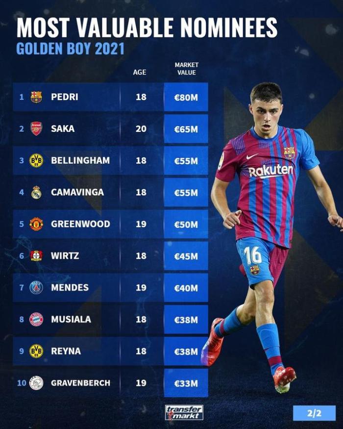 来源:24直播网09-20 11:3324直播网9月20日讯 此前,《都灵体育报》公布了金童奖入围的40名球员名单。今日,德转也列出了名单中身价排名前20的球员,其中佩德里以8000万欧元的身价位居首位。