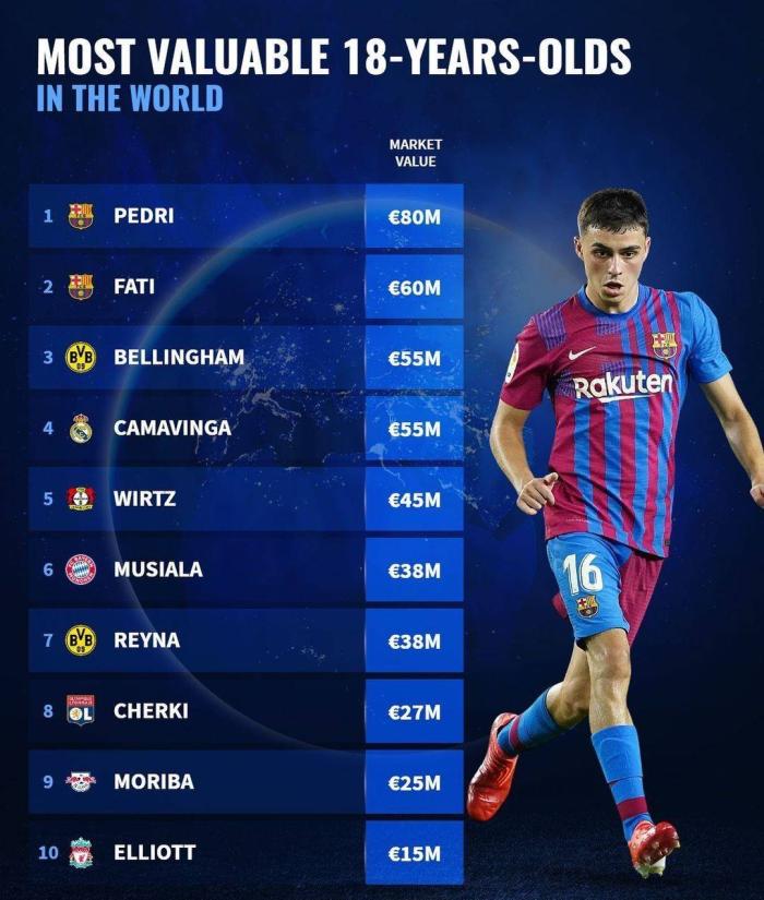 足坛18岁小将身价排行!巴萨强势包揽前二,皇马新援上榜
